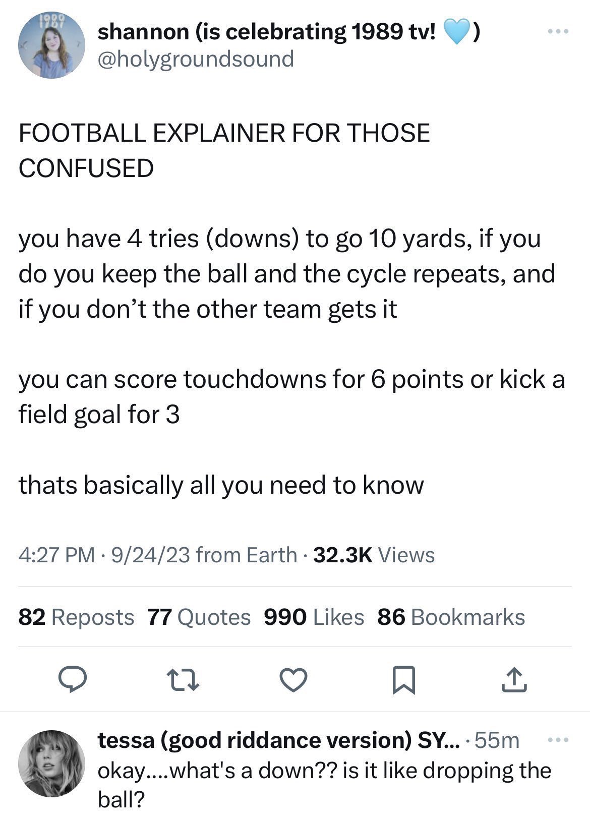 All of the swift fans learning about football on twitter is really kinda hilarious