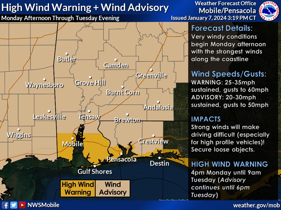 Strong gradient winds (non-thunderstorm winds) will be an issue across all of Mississippi and Alabama tomorrow/tomorrow night.