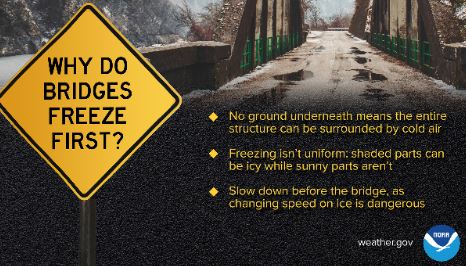 Be aware of elevated surfaces that may freeze, take your time and cautiously, and get to your destination safely.