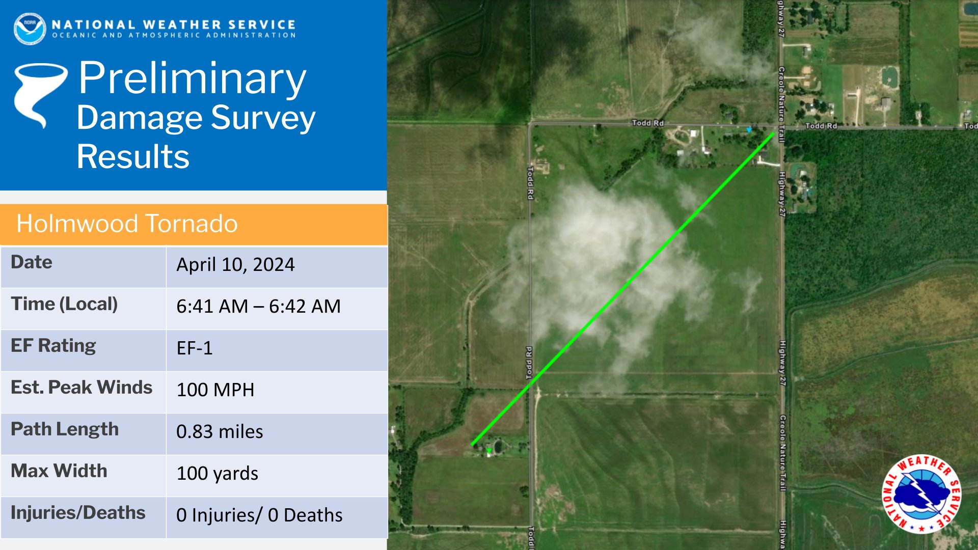 Three more tornadoes were confirmed this afternoon from Wednesday morning's severe weather. An EF-1 was confirmed between Lacassine and Welsh, An EF-1 was confirmed in central Lake Charles and an EF-1 was confirmed near Holmwood. This brings the total in our region to 10.