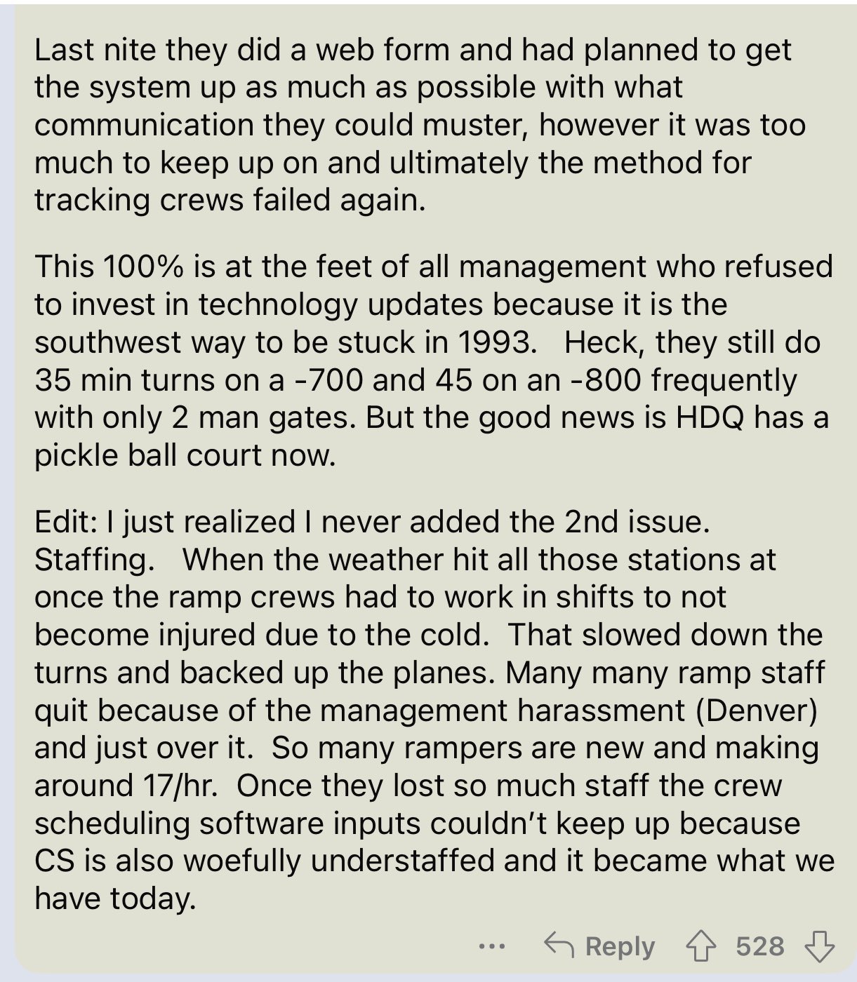 Learning that the Southwest Airlines meltdown is due to an antiquated crew scheduling system that assumes where a crew member is instead of working off live flight data. They’ve lost track of almost every crew member and the only way to solve it is for each one to individually call scheduling to tell them where they are. Their phone lines are swamped and I’ve seen screenshots of crew on hold for 23+ hours trying to get through to scheduling.
