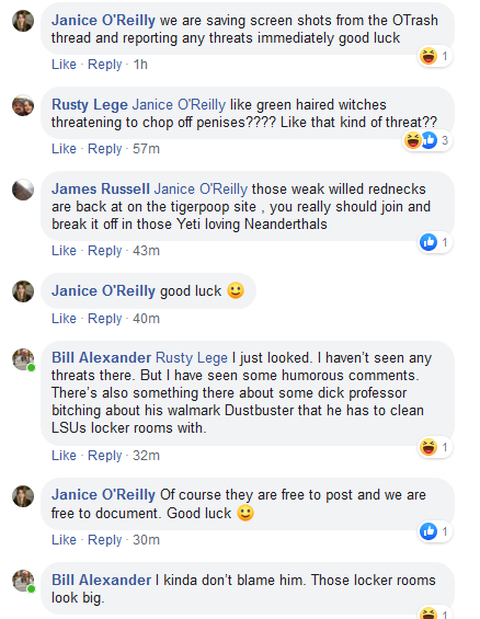 Bill Alexander Rusty Lege I just looked. I haven’t seen any threats there. But I have seen some humorous comments. There’s also something there about some dick professor bitching about his walmark Dustbuster that he has to clean LSUs locker rooms with.