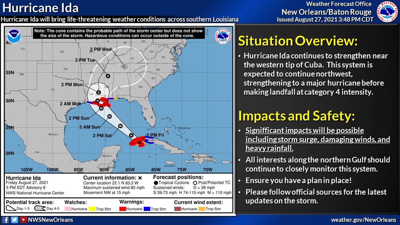 4PM CT Ida Update - The time to act is NOW. Hurricane Ida is now forecast to make landfall as a category 4 hurricane. This will bring SIGNIFICANT impacts to Southern Louisiana and Southern Mississippi. No major changes to the track at this time, moved just a touch to the east.