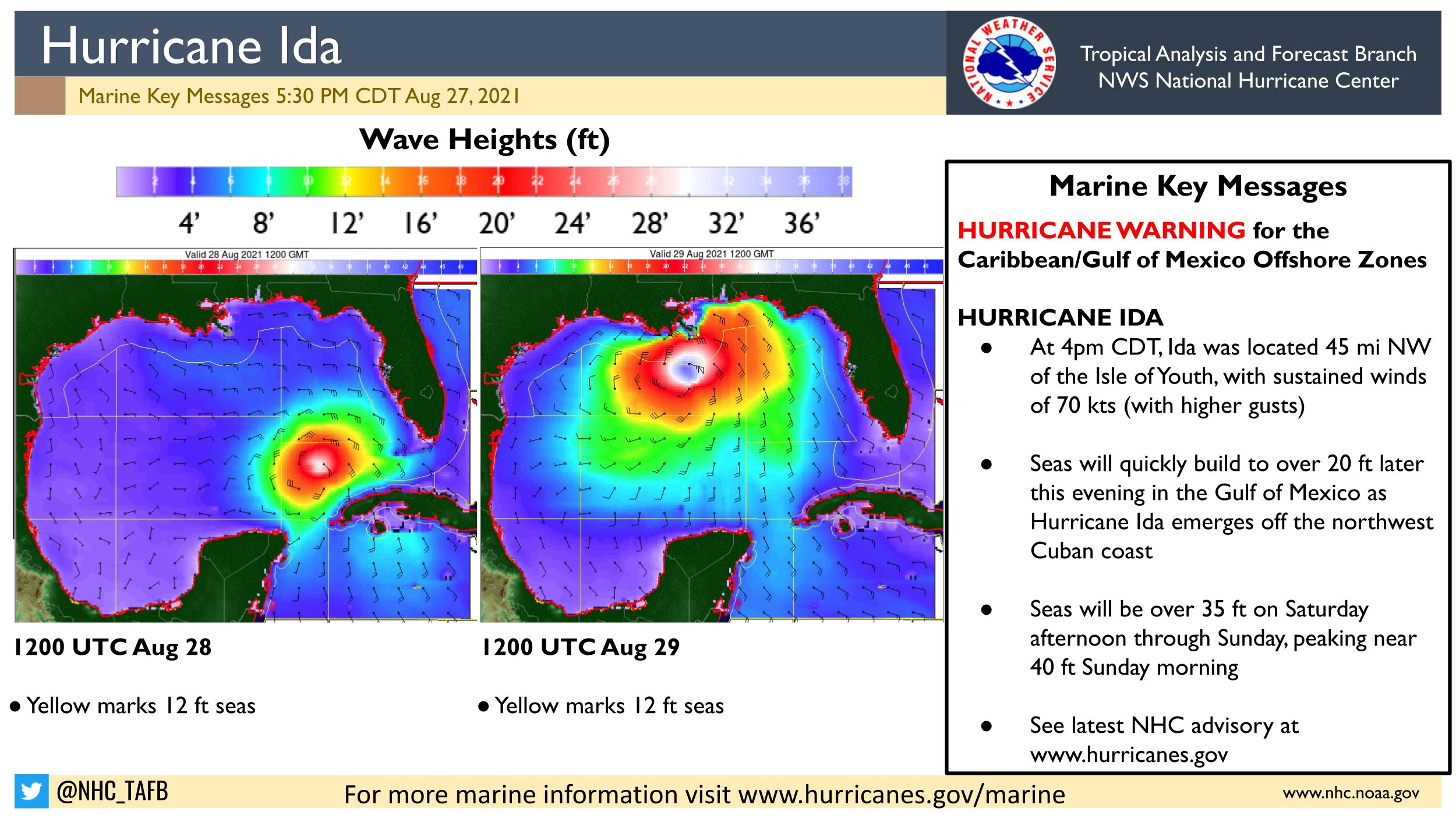 [5:30pm CDT Aug 27] Here are the latest Marine Key Messages for Hurricane #Ida, which is expected to enter the Gulf of Mexico tonight. Peak seas in the Gulf will quickly build to 20 ft.