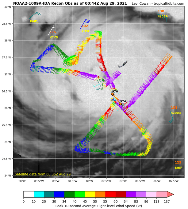 New recon pass through the eye of #Ida shows another pressure fall, and higher wind estimates of 100-105 mph at the surface within the eyewall.