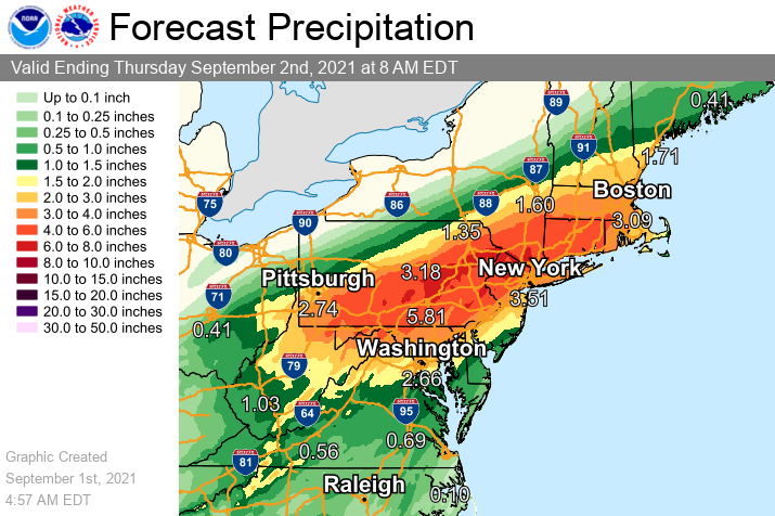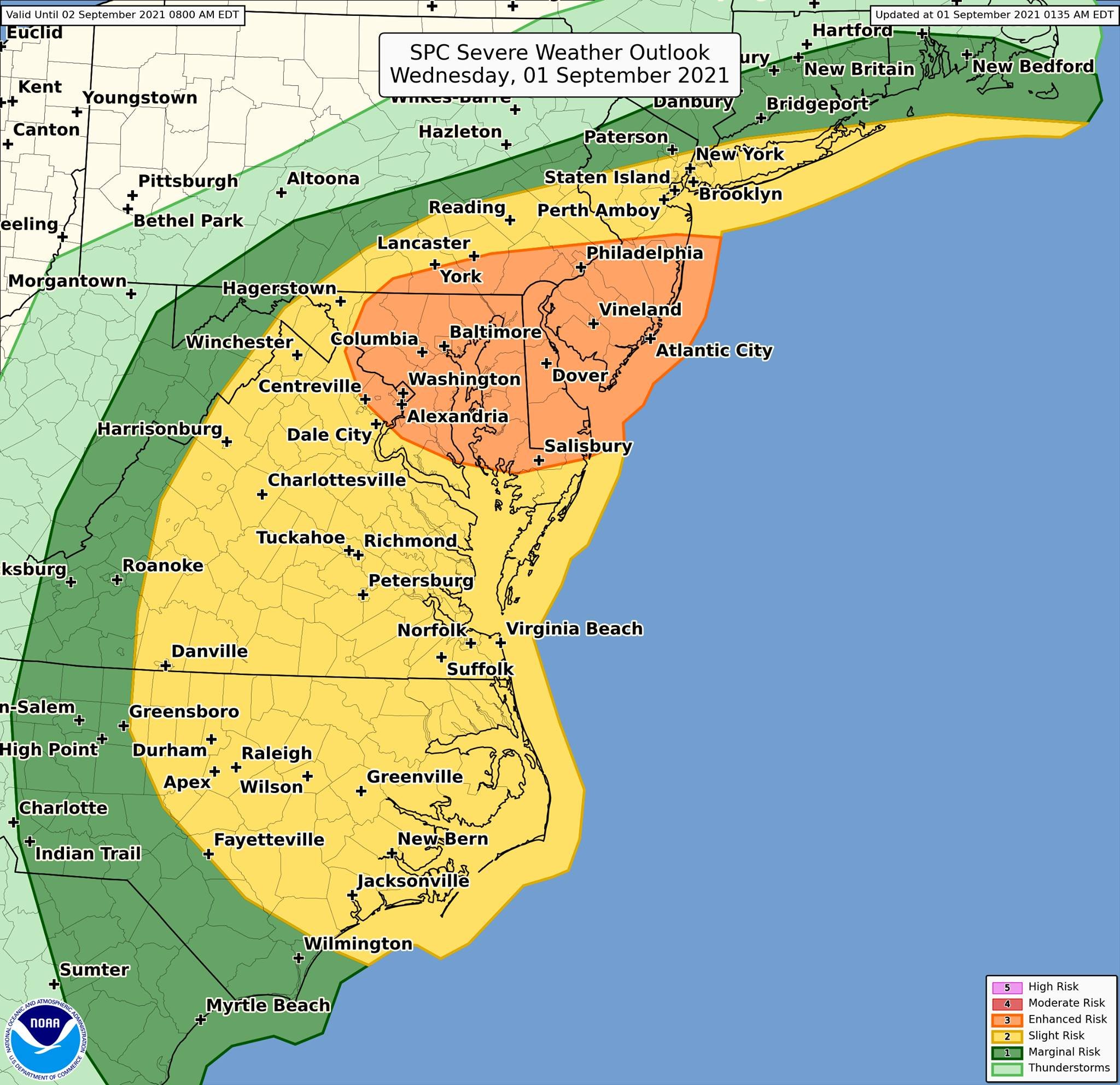 T.D. Ida is expected to produce heavy rain and severe, widespread flash flooding across the Mid-Atlantic into southern New England. Several tornadoes and scattered damaging winds are also possible across parts of the Mid-Atlantic as Ida moves through the region later today.
