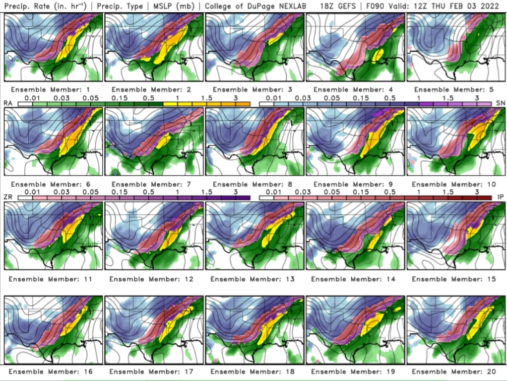 So much depends on how far SW the main upper shortwave/upper low tracks. Models now have it digging to around or north of El Paso. If it buries itself down deeper into Mexico then things change a good bit. If it does dig a bit deeper into Mexico you will see near blizzard conditions locally across North Texas but if it tracks north of EP then N TX may be a freezing rain and sleet mess. Us in East Texas could see a very nasty ice storm per the current GFS track. Midday Thu right now shows low 20s with heavy rain. Pwats over 1 with temps in 20s is pretty wild.
