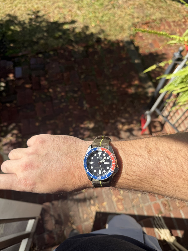 I’ve been wanting to get a SKX back in the collection after letting a lady borrow my 007 back in my LSU days and never seeing it again. The fading on the Pepsi bezel is pretty rad in person and the red “Diver’s 200m” has degraded to yellow. Given how dark the dial is, this may be a 007 that someone stuck a 009 bezel on. It’s been fun throwing it on different straps: