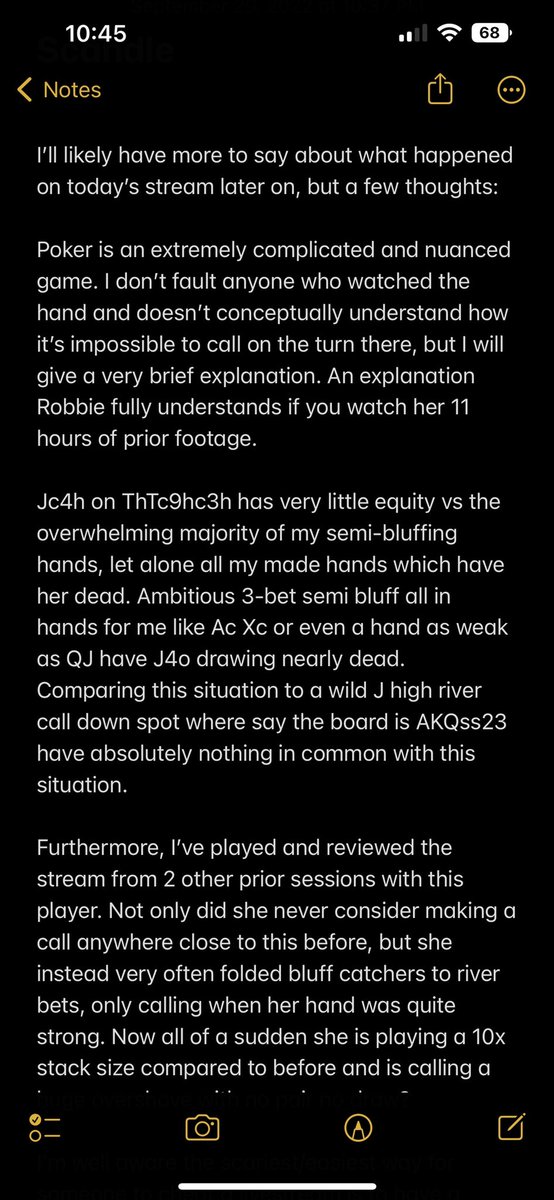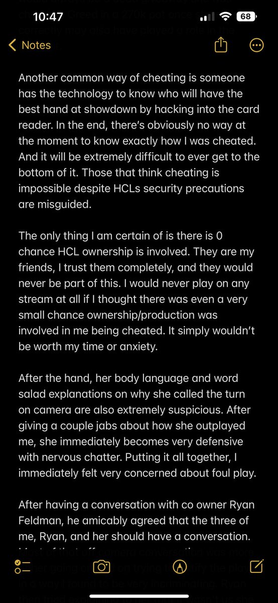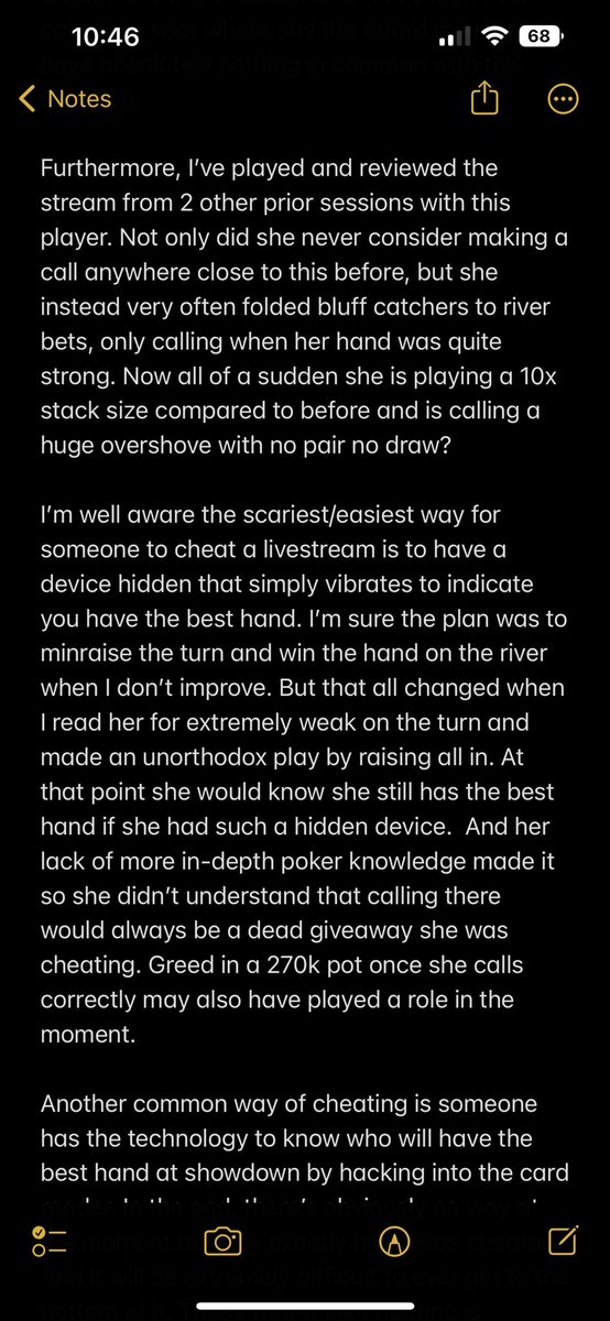 You would if humans were perfect logical robot like machines but we aren't so it's possible in the heat of the moment she fricked up cheating in a situation that would make the cheating too obvious OR, like he mentioned in his post, the large pot size may have caused her to just go for it in a situation where it was too obvious