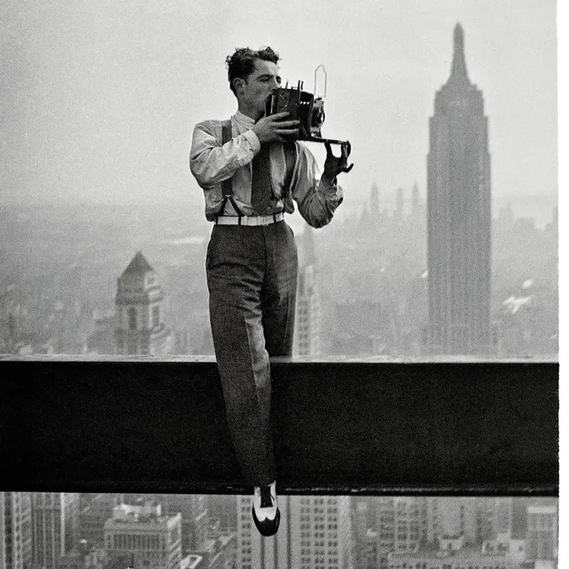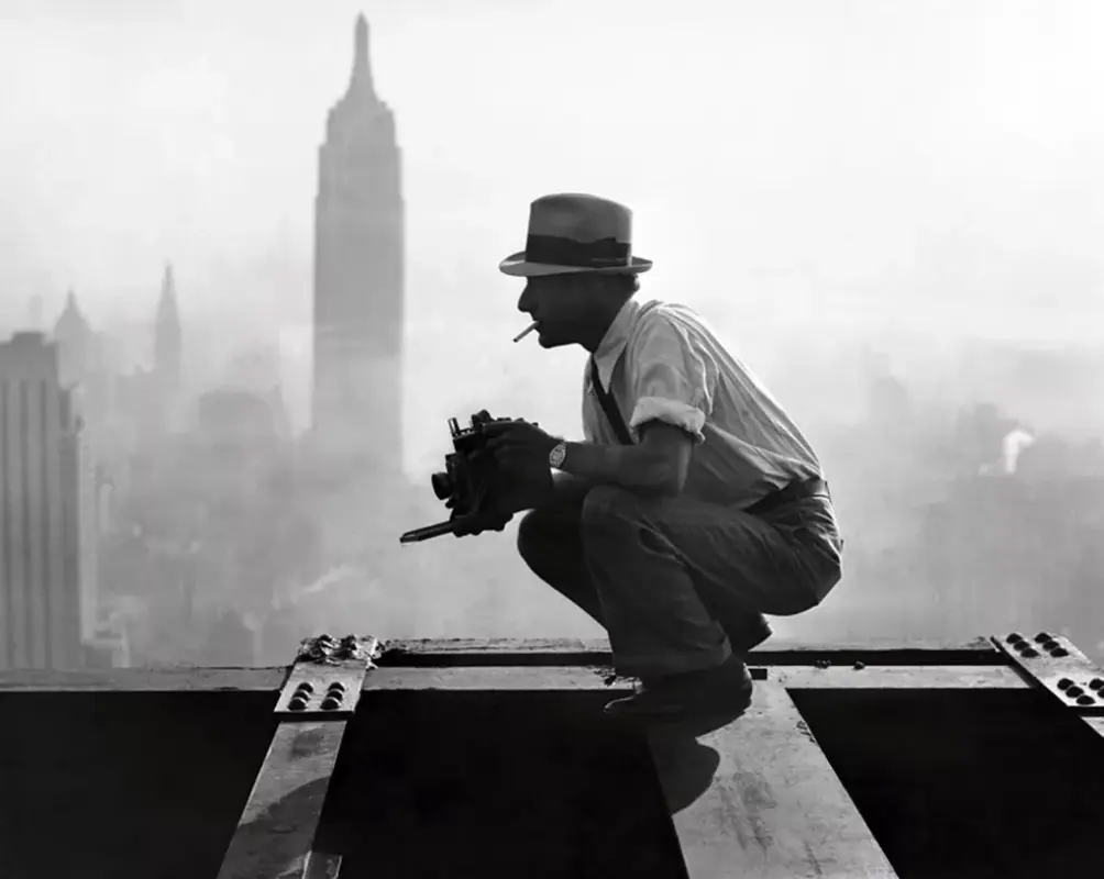 Within the first year, his work appeared on multiple front pages. One of his masterpieces was “The Photographer” (seen below). However, his most famous was “Lunch atop a Skyscraper” This photo featured 11 ironworkers having bagged lunches on top of a huge metal beam. The image represented your average everyday worker caught in the chaos of the growing times. It is known as one of the most iconic representations of 20th century American photography. His daring aerial shots shocked Americans and led the building to a successful launch a few years after the end of the Great Depression.