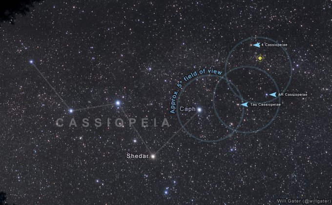 An erupting white dwarf in the constellation Cassiopeia should be visible with binoculars or small telescopes on a dark night.