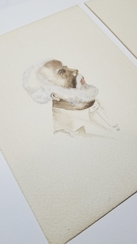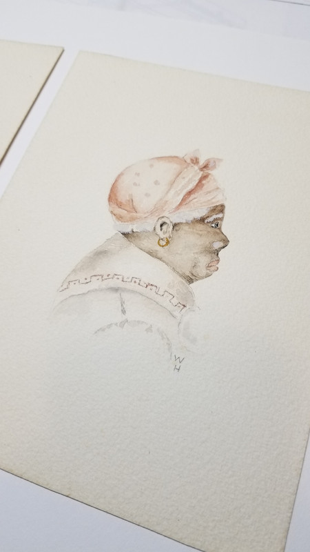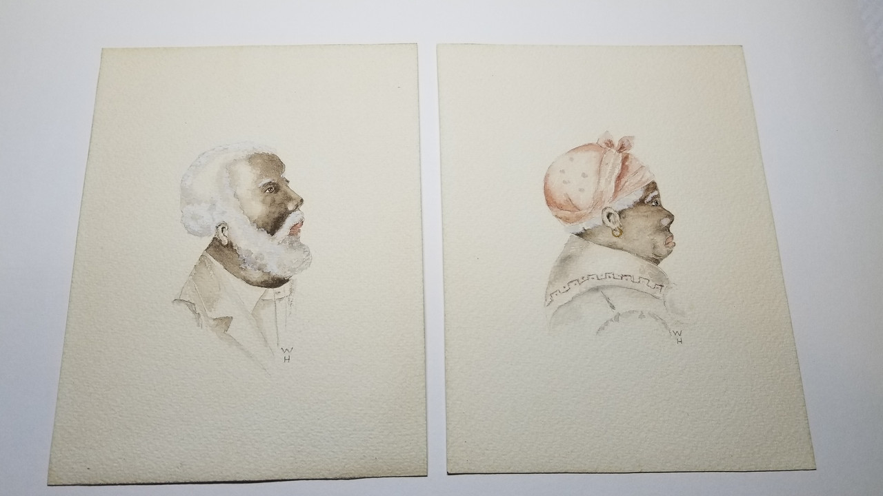 Here's something for you to try to chase down that I've never had any luck with over the years. It is a pair of Black Americana watercolor portraits. They're pencil scetched and then painted with watercolors. They're on quality watercolor paper, but were cheaply framed with cardboard backing. We bought them from a good friend of ours, an elderly black lady in our neighborhood who was in her late 80s at the time. She said she had them for "years and years" was all she said about them. She passed a year or so later without telling us much else about them. The artist's mark on both is a W over an H. The only mark on the back is an X in pencil. They aren't prints, I can tell that much.