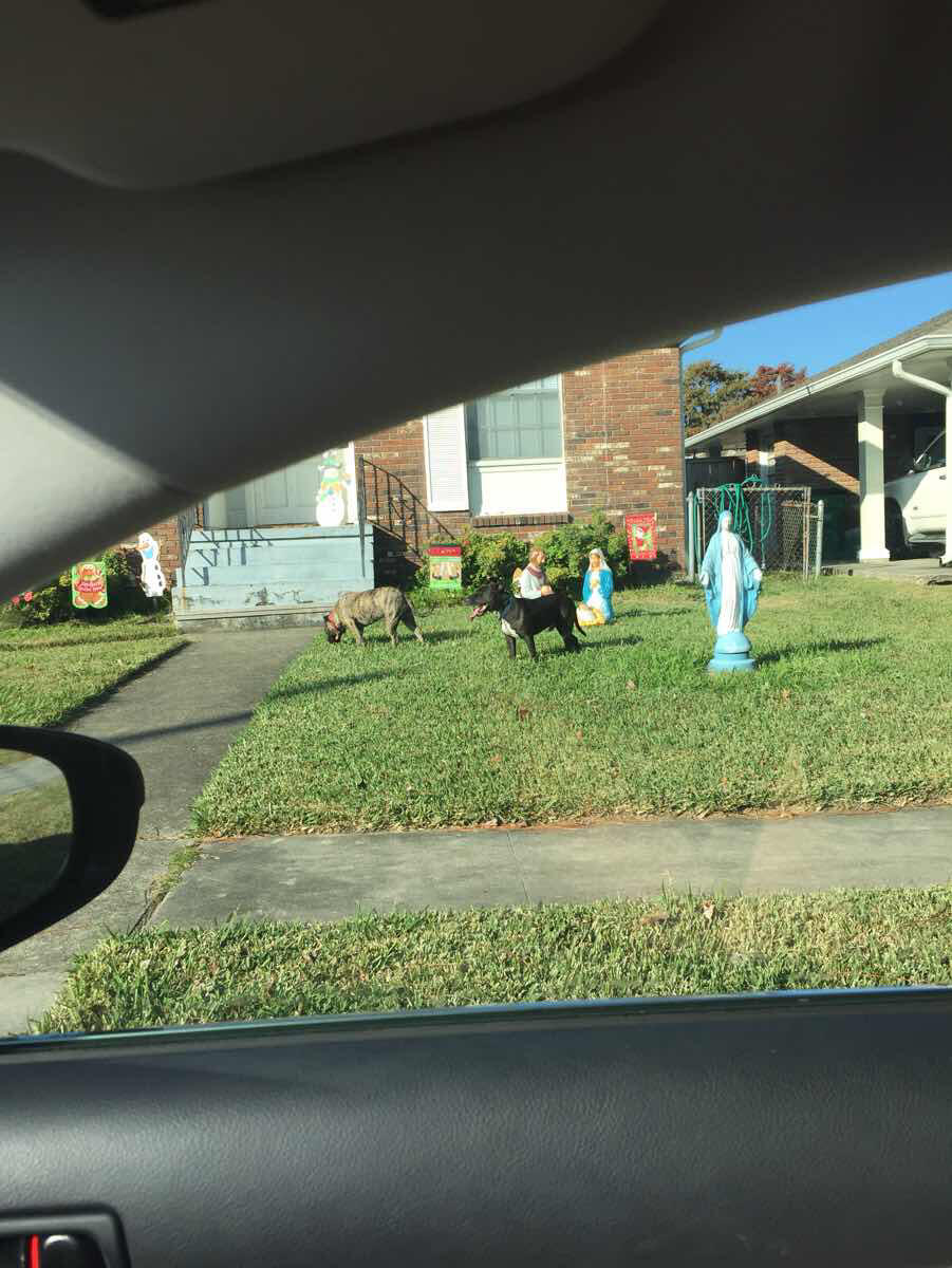 This morning there were 2 pitbulls (see photos) who were wondering the streets on Taft Park in Metairie. An elderly lady was walking a small dog there. They attacked her and the dog. She fell down, hurt herself and she has bite marks on her hand because she was trying to protect her dog. Her dog has bites all over his neck and head. EMS and Animal control were called. An man and a woman were walking behind the dogs. They had leashes with them but not on the dogs. These people disappeared once the incident happened. Animal control picked up the pitbulls. Wondering if anyone knows whose dogs those are and be careful around Taft, they will probably be returned to the owners and do this again.