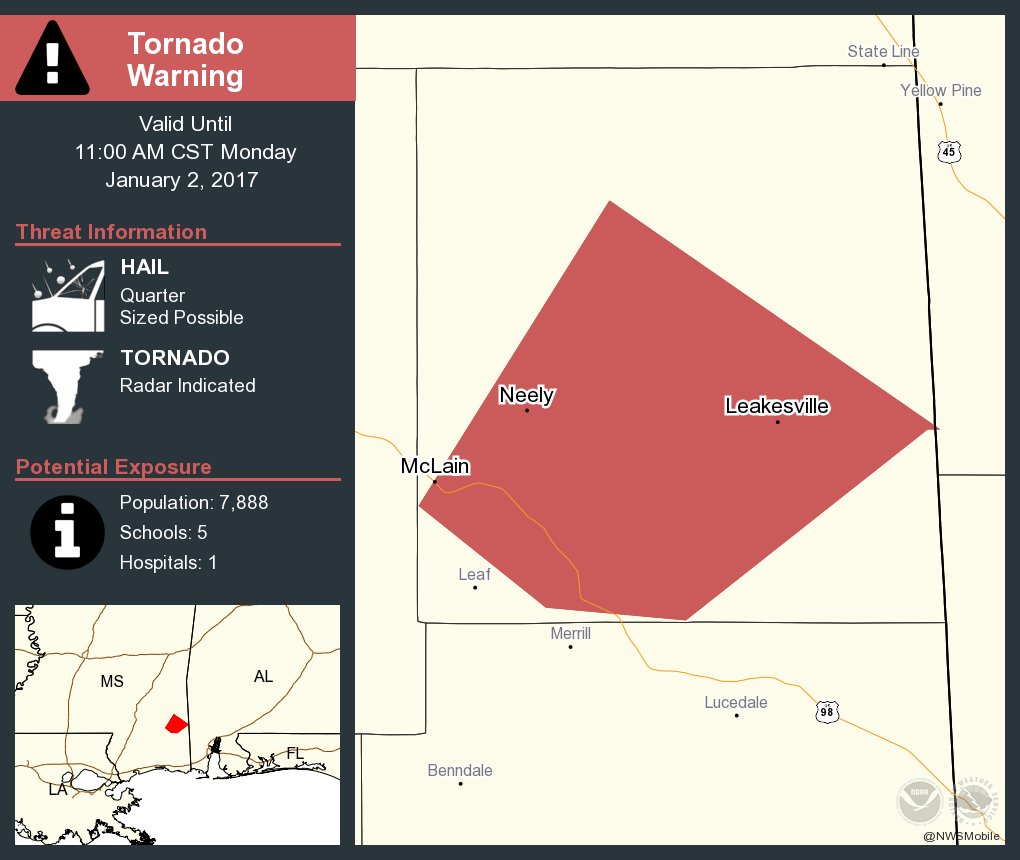 Tornado warning: radar indicated tornado likely 9 miles north of laPlace, La moving NE at 30 mph.