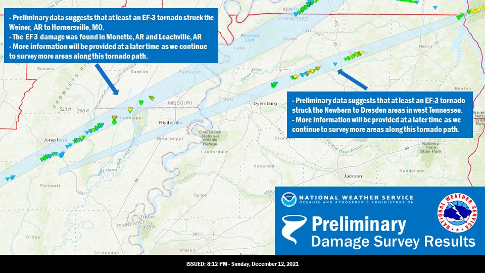 Preliminary findings suggest that at least two EF-3 tornadoes struck the Mid South Friday evening. We will continue to survey the damage along the paths of these two long track tornadoes. Rating is subject to change as we acquire more data.