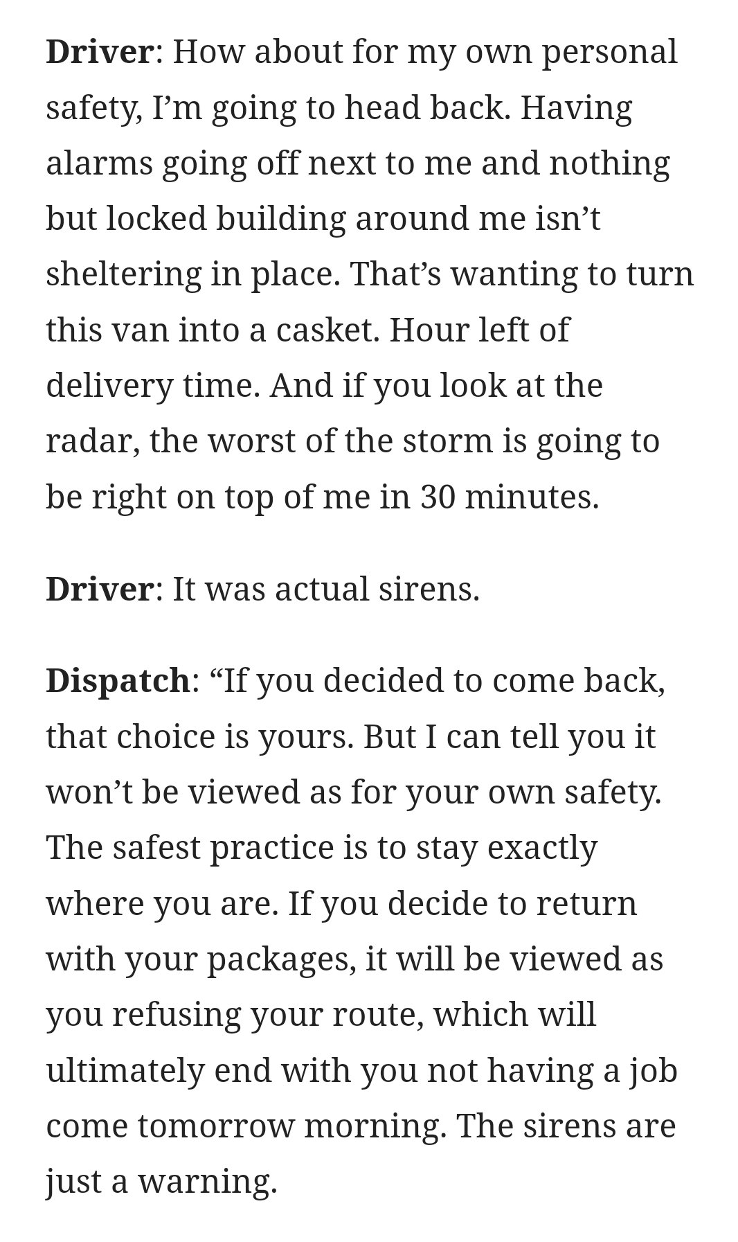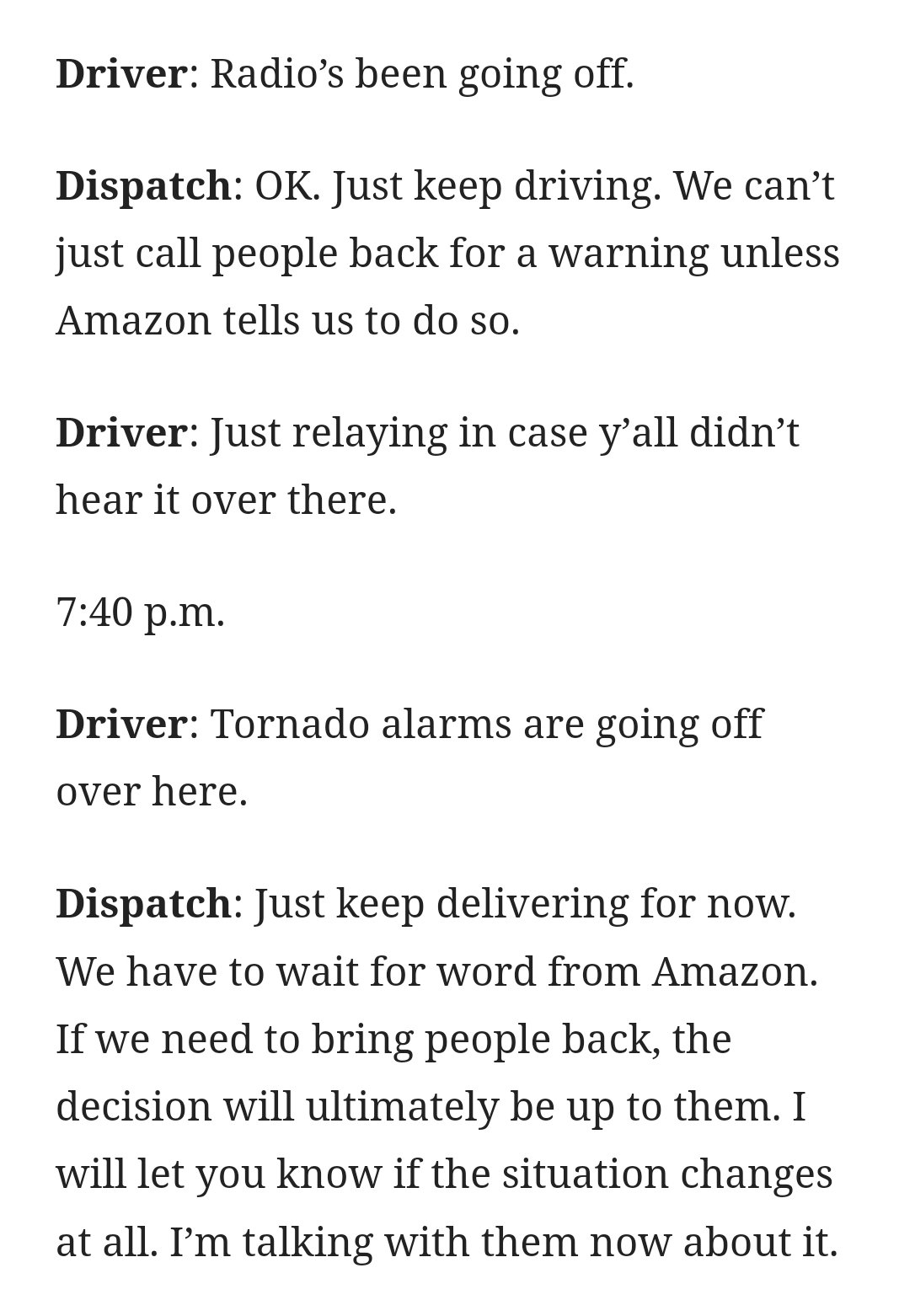 Some texts from an Amazon driver and dispatch during the Illinois tornado.