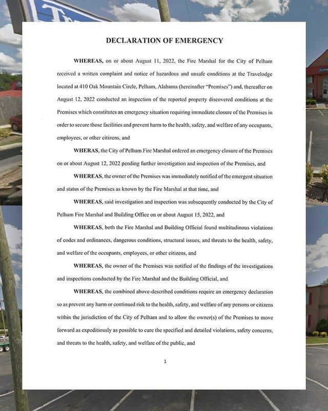 The closure order stated in part, "On or about August 11, 2022, the Fire Marshal for the City of Pelham received a written complaint and notice of hazardous and unsafe conditions at the Travelodge located at 410 Oak Mountain Circle, Pelham, Alabama (hereinafter "Premises") and, thereafter on August 12, 2022, conducted an inspection of the reported property discovered conditions at the Premises which constitutes an emergency situation requiring immediate closure of the Premises in order to secure those facilities and prevent harm to the health, safety, and welfare of any occupants, employees, or other citizens."