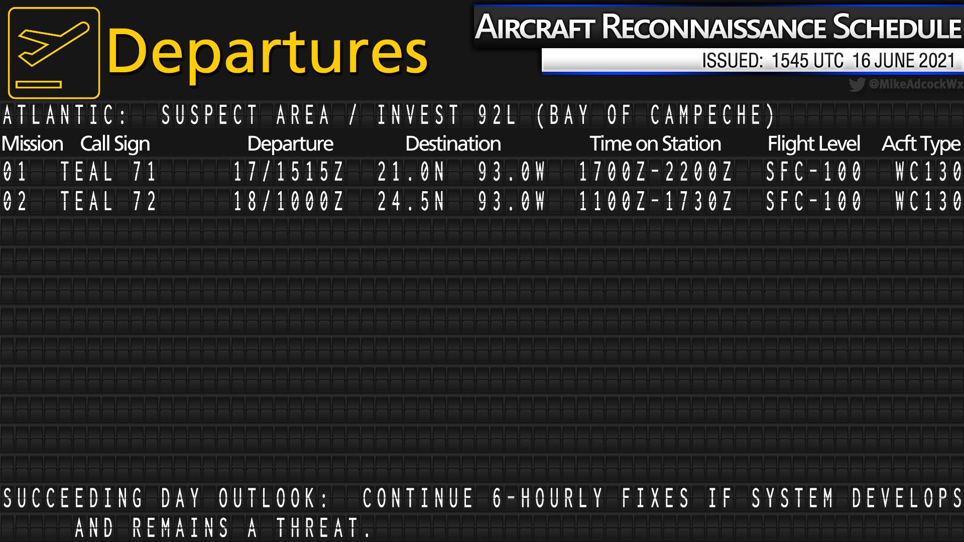 Recon schedule for Invest #92L in the Bay of Campeche.