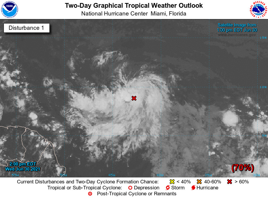 2 PM EDT: NHC is monitoring a broad low pressure area with a high chance of tropical cyclone formation in the next 48 h. Potential tropical cyclone advisories are likely to be issued later today, and Lesser Antilles interests should monitor this system