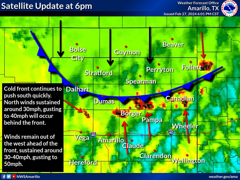 6pm: Cold front continues to push south. Current fires ongoing to the northwest of Boys Ranch, across northeast Potter County, northwest Carson County, between Borger and Miami and across southern Hemphill county (south of Canadian).