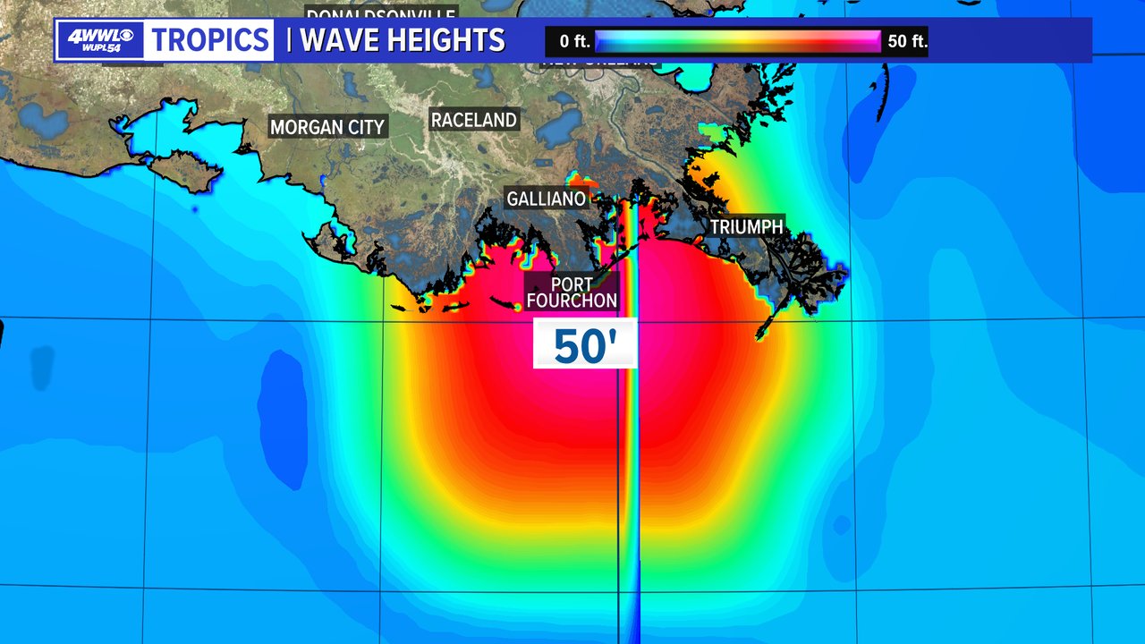 WWL is ridiculous. This is sensationalism/a very crappy model. In coastal engineering, wind driven, depth-limited waves (e.g. waves in a nearshore and not open ocean environment) have an easy rule of thumb that governs most situations: the wave at breaking (let's call this its height limit) can only be ~75% of the water depth. A 50' wave would require at least 67' of water, which rules out everything in this picture inside of about 10 miles offshore.