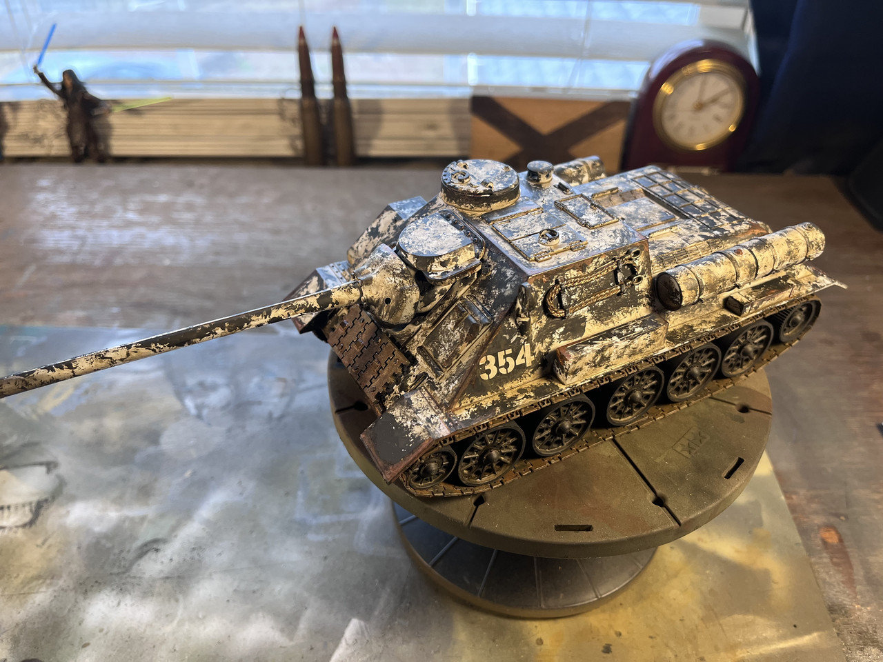 (Yes, this one was done rather fast. I started it yesterday afternoon right after I finished the Do.17. But this was a super simple kit. It’s a re-release of the Tamiya SU-100 kit from the mid 60s. I think total assembly time was less than an hour. I had that done by 5 PM yesterday. All I had to do today was painting and weathering.)