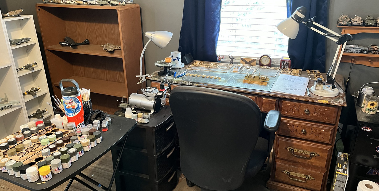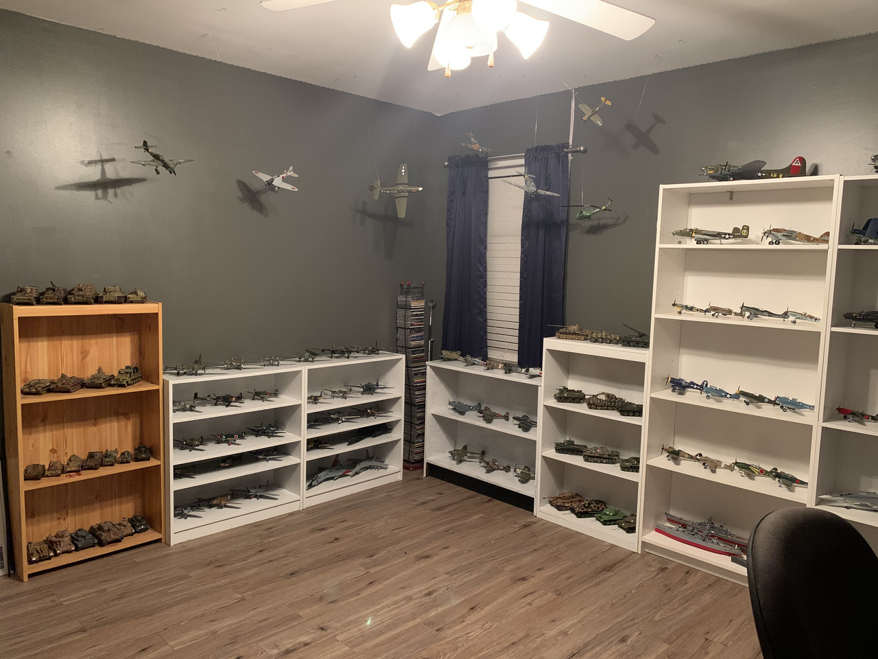 My model room, actually my son’s old bedroom, is where I build and display them.