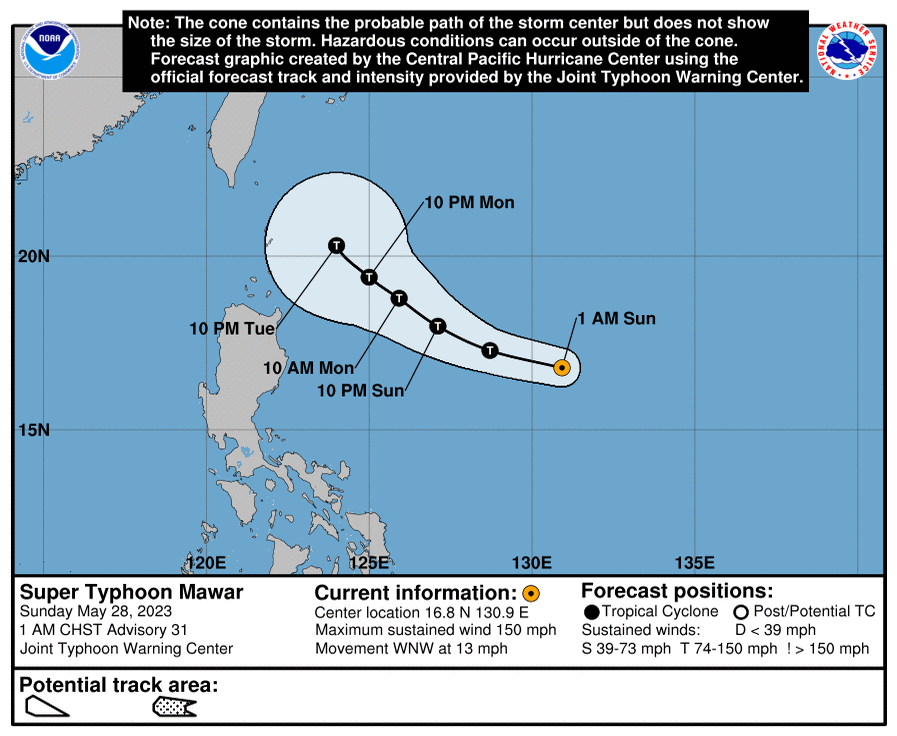 As of their latest update the center of Mawar was 85 miles southeast of Guam. Max sustained winds at 155 mph.