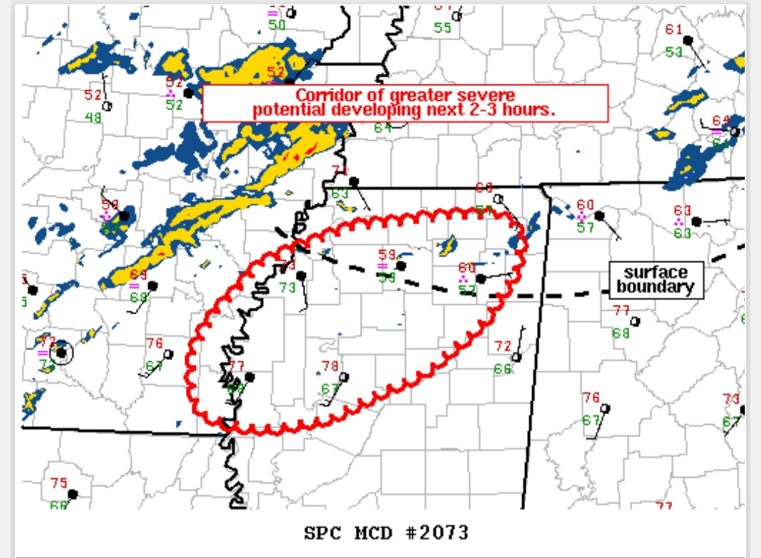 I'm seeing some folks on weather message boards talk about the placement of the highest tornado risk. Right now, Tupelo is in the hatched area, however, Tupelo has a temp 59 degrees with a dewpoint of 57 degrees. It would take some major WAA to ripen the atmosphere back up enough for severe storms. Perhaps the greater risk needs to be shifted south or southeast. Birmingham is partly sunny with a temp of 73 and with a dewpoint of 69.