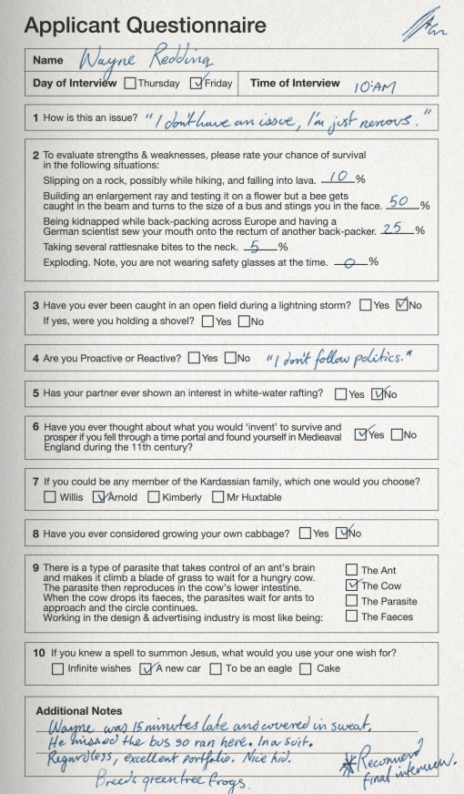 I am interviewing a few people this week for a position and I have some off the wall questions I have thrown in to see how they answer.