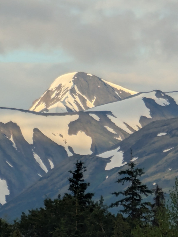 Sitting on a bench in the afternoon sun at 9pm at the Princess Kenai Wilderness Lodge enjoying the scenery.