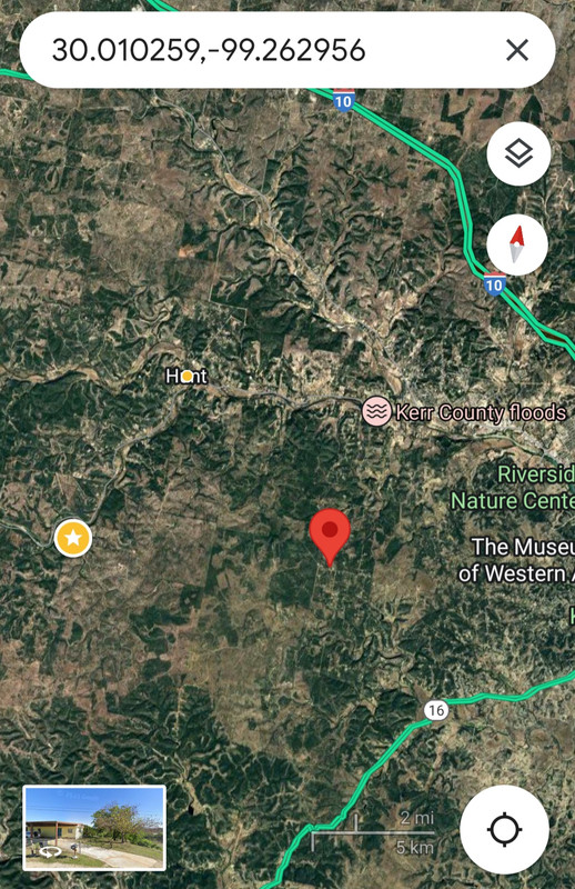 The star is the location of Camp Mystic. The dot is Hunt, TX. It is 6.5 miles from Camp Mystic and 6.1 miles from Hunt.
