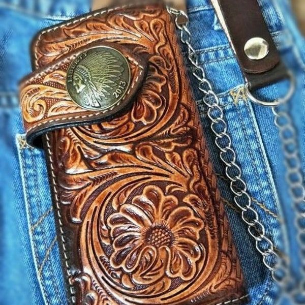 Gaudy carved leather, lots of decor, pistolas, sombreros, toros, bordered by roses.