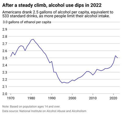 Alcohol use in the U.S. has fluctuated significantly over the years, peaking around the mid-1980s before declining
