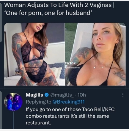 If one is for porn and the other is for her husband it’s just regular porn. Except she says “wrong hole” a lot more than the average woman.