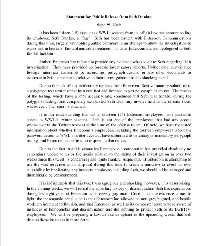 1) per the last line of the lawyer's statement, seth dunlap will be filing suit against entercom for discrimination. i guess it goes without saying that his days at WWL-AM are over.