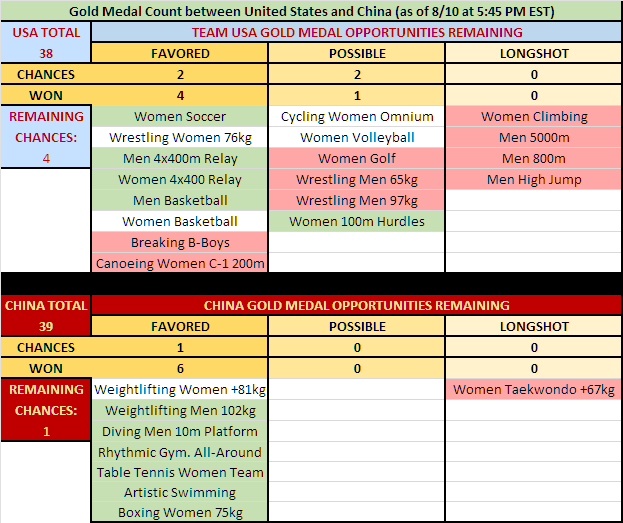 Full breakdown of final few remaining events: USA vs Chyna