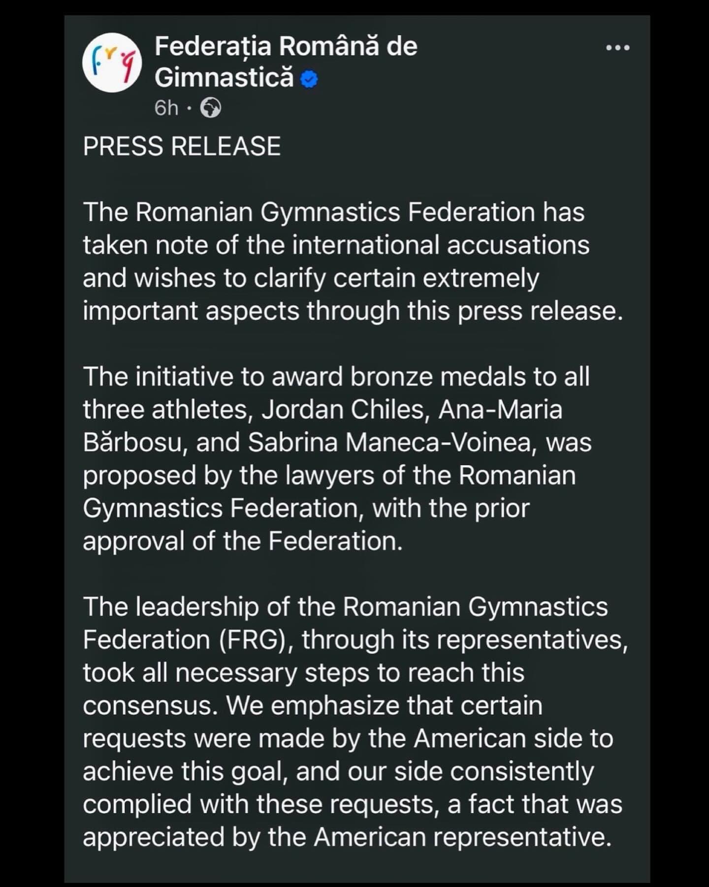 At this point, I don't think Barbosu is pushing for any of this. She's just caught in the middle. The Romanian Gymnastics Federation is pushing, but they requested all three gymnasts get bronze, which can't happen due to the rules. No one wins, here, it seems.