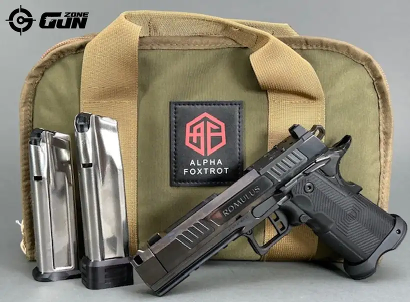 $1,600 w/ $300 Instant In Cart Rebate! Alpha Foxtrot Romulus 4.25" Compensated 20+1 RMR & RMSc Cut 2011 9mm Pistol, Match Barrel, Nights Sights, Flared Magwell & High Polish DLC Coated Slide & Frame - Final Price $1330 S/H $25.95