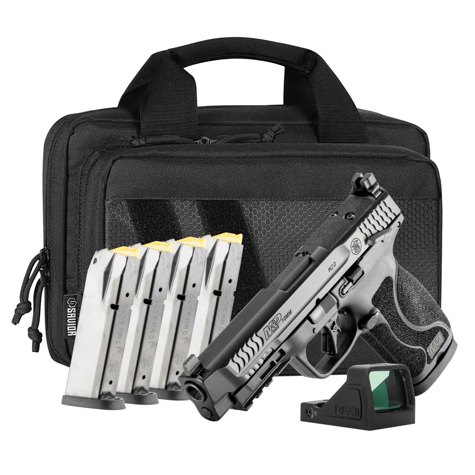 Smith & Wesson, M&P M2.0, Striker Fired, Semi-automatic, Polymer Frame Pistol, Full Size, 10MM, 4.6" Barrel, Armornite Finish, Black, Optic Height White 3 Dot Sights, Thumb Safety, Viridian RFX11, 15 Rounds, 5 Magazines, Carry Bag - $599.99