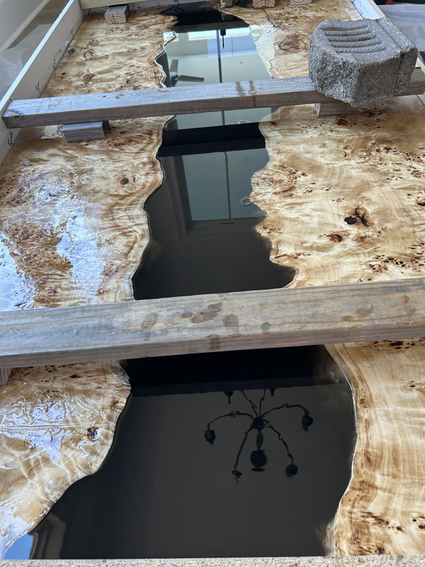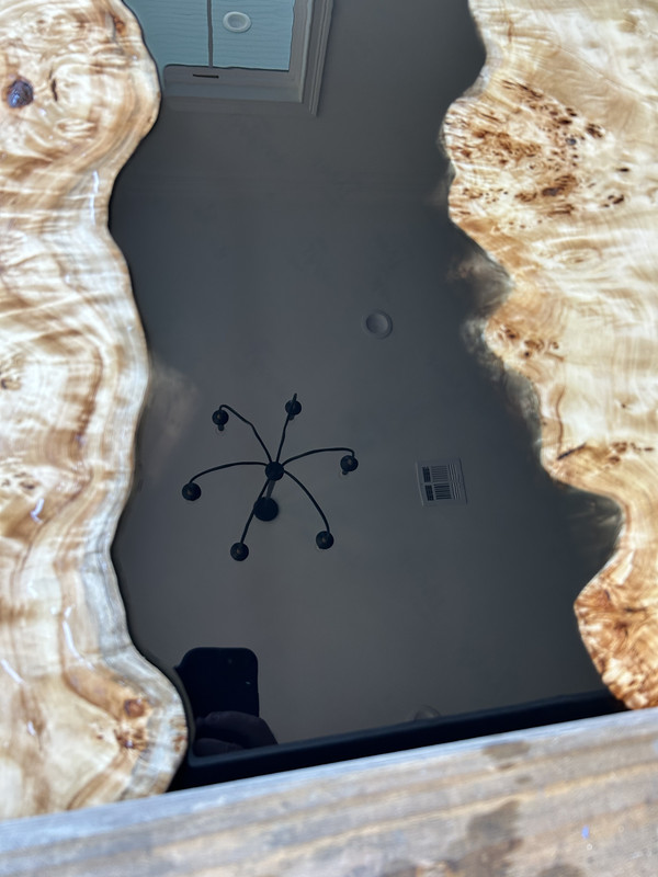 Here’s an update to the table. Made a mistake during the second pour. I don’t know if the table shifted but the epoxy on the mold on one end wasn’t at the top of the live edge like the other end so I had to mix a little more epoxy and add to the pour. Problem is that added epoxy hasn’t set. Called the manufacturer and they said to give it a few more days. If it doesn’t set then scrape it off and just have it sanded down to the hardened epoxy. It’s not a big deal. Lose maybe a 1/4” off the table. I must not have mixed well enough. Here’s some pics. I decided on a smoke color so you can still see some of the live edge
