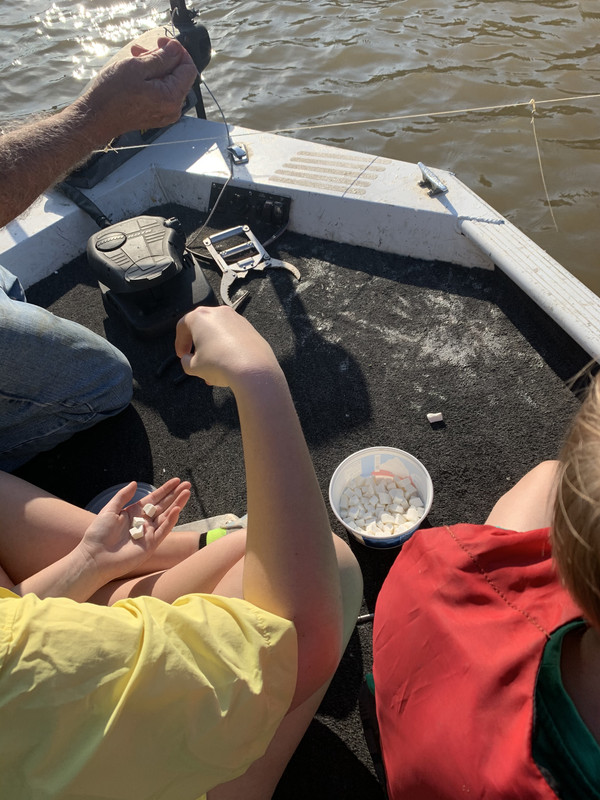 When soap isn’t working or the water starts to clear up we switch to shiner/cut bait. We set out glass jugs and catch them by the hundreds.