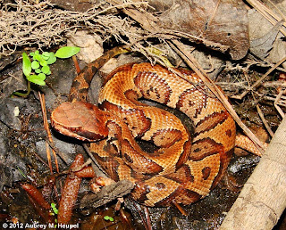 Juvenile Cottonmouths are often confused for juvenile Copperheads due to their vibrant pattern that usually darkens quickly as it matures. Notice below, however, that the pattern of the juvenile Cottonmouth is much more jagged than that of the juvenile Copperhead. There is also more spotting and such within the bands of the juvenile Cottonmouth than the juvenile Copperhead. Lastly, the thick black bar that runs through the eye and is bordered below by a thin white line is absent in the juvenile Copperhead.