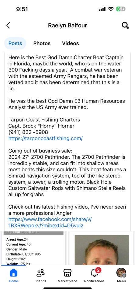 As per Tarpon Coast Fishing Charters, Captain Brock Horner is a sixth-generation Floridian and the owner of Tarpon Coast Fishing Charters, operating primarily in the Sarasota, Charlotte Harbor, Boca Grande and Tampa Bay areas. He has 25 years of fishing experience, the website claims. As per Florida arrest records, Horner has been arrested 12 times.