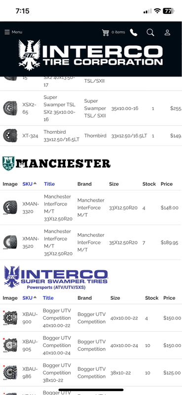 I recently put the Manchester 33x12.5x20 mud tires on my truck and have about 5000 miles on them so far. I was gonna go with the super swampers but the guy that works there said the Manchesters were much quieter. I haven’t hit any real mud with them and probably won’t until deer season, but they look to have good grips and for $148 per tire, I’ll give them a shot.