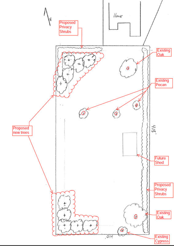 Brothers, below is a sketch of my back yard. I want to add some privacy shrubs on the east side and northwest corner. I also want to plant some trees in the northwest and southwest corners to frame the property. The two oaks and the cypress tree are staying, I could take or leave the pecan trees (they’re scraggly). Doesn’t need to be instant privacy, this is a long term approach.