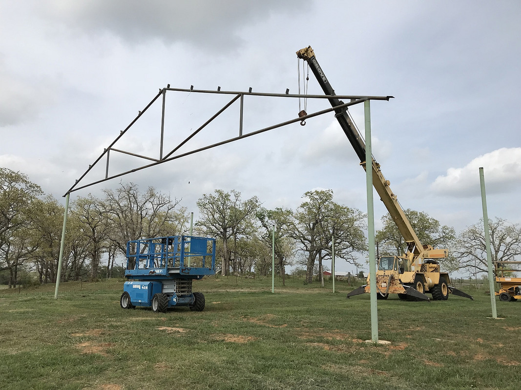 50x90 with 18x35 offset porch, last 28' is barn area. Trusses are 2 7/8 pipe welded into Howe's with were dropped into 4.5" pipe. If I had it to do over again, the trusses would be 4" square tube 3/16 wall. I spent too much time with the plasma cutter and templates cutting 5 trusses out then welding them. Started life off as a shed above our pond and the view and location grew on us.