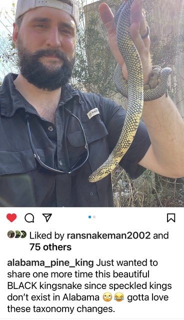 The yellow area running across Alabama, Mississippi, and southeastern La. has what are now called Eastern Black kingsnakes. Most that are called Eastern blacks look basically like speckleds, and most old school snake guys think it’s ridiculous to call them Eastern blacks. But genetically, they are their own species, separate from speckled kings.