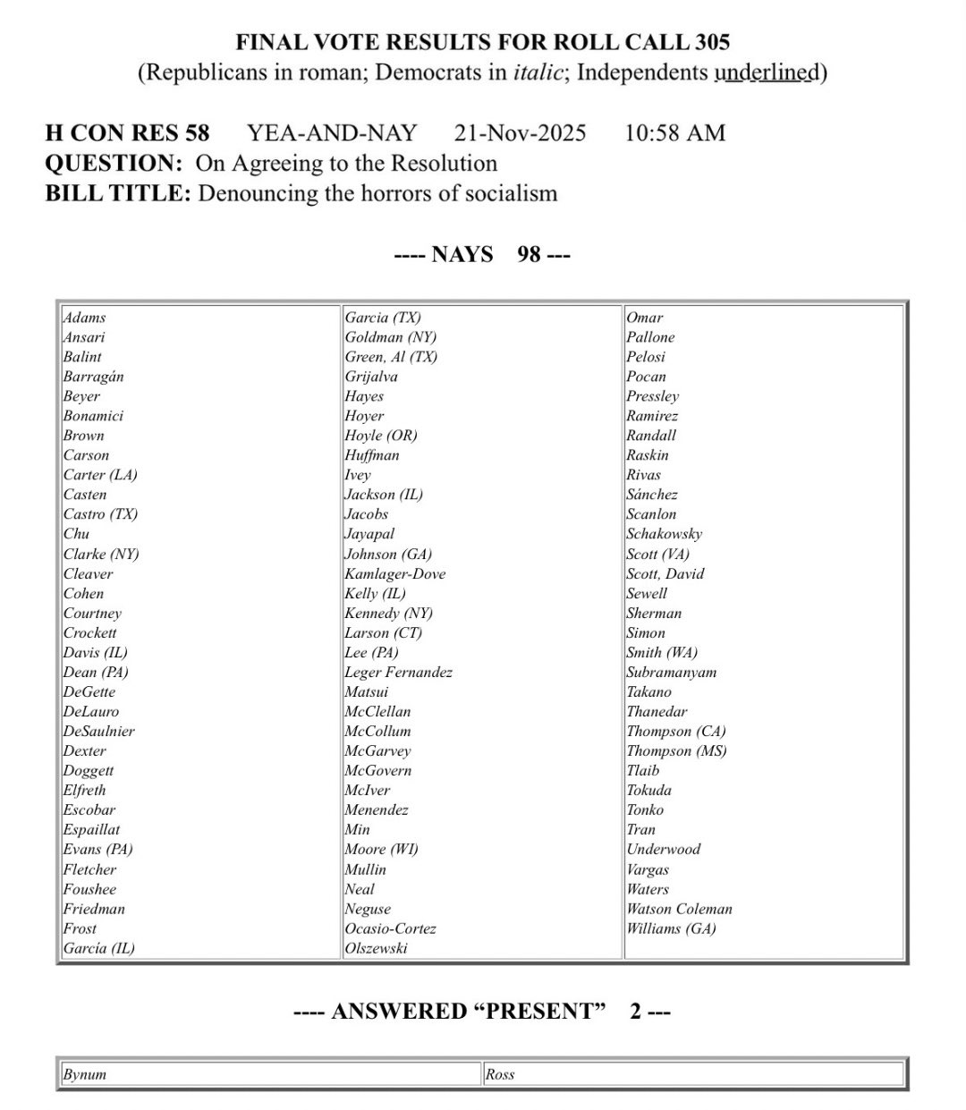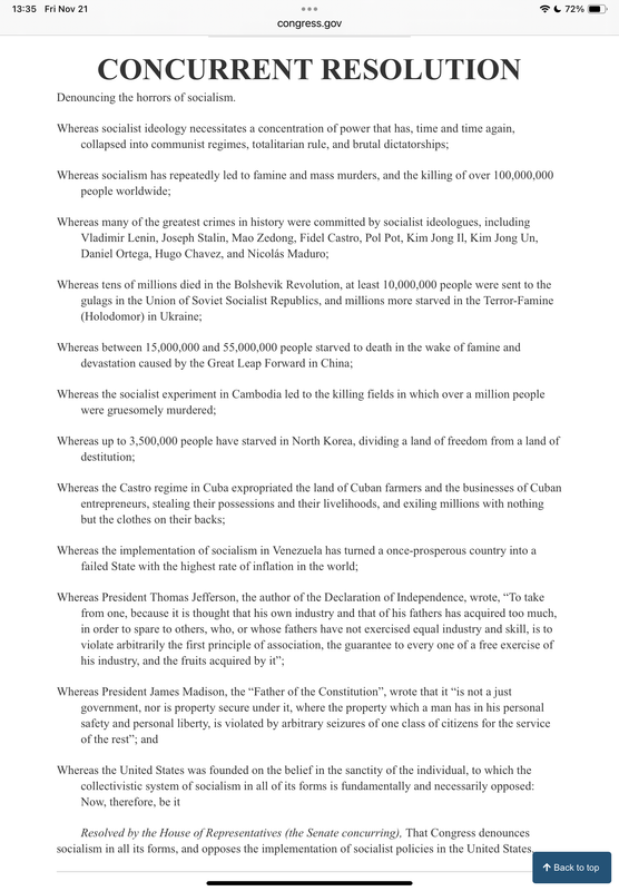 Resolved by the House of Representatives (the Senate concurring), That Congress denounces socialism in all its forms, and opposes the implementation of socialist policies in the United States.