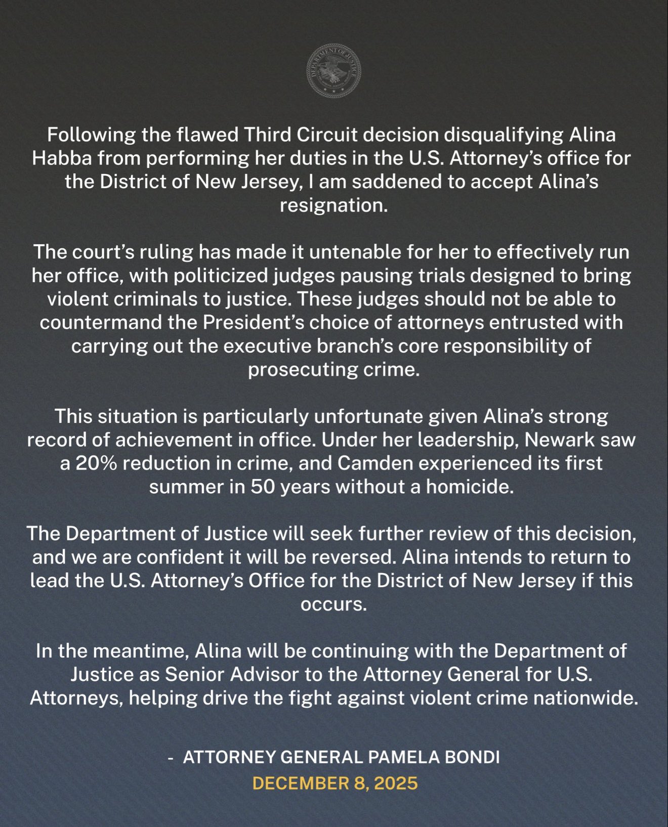BUT: The Department of Justice will continue to FIGHT for Alina, and when they win, Alina will retake her post, per AG Bondi